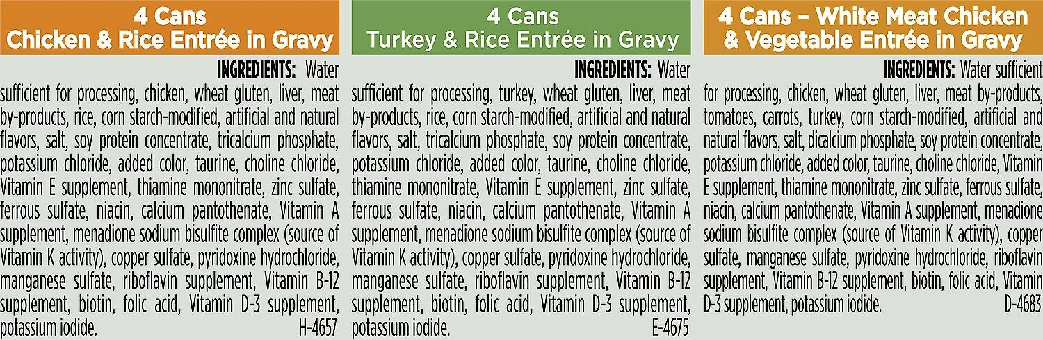 Chicken & Rice Entree in Gravy: Water Sufficient For Processing, Chicken, Wheat Gluten, Liver, Meat By-Products, Rice, Corn Starch-Modified, Artificial and Natural Flavors, Salt, Soy Protein Concentrate, Tricalcium Phosphate, Potassium Chloride, Added Color, Taurine, Choline Chloride, Vitamin E Supplement, Thiamine Mononitrate, Zinc Sulfate, Ferrous Sulfate, Niacin, Calcium Pantothenate, Vitamin A Supplement, Menadione Sodium Bisulfite Complex (Source of Vitamin K Activity), Copper Sulfate, Pyridoxine Hydrochloride, Manganese Sulfate, Riboflavin Supplement, Vitamin B-12 Supplement, Biotin, Folic Acid, Vitamin D-3 Supplement, Potassium Iodide. H-4657.