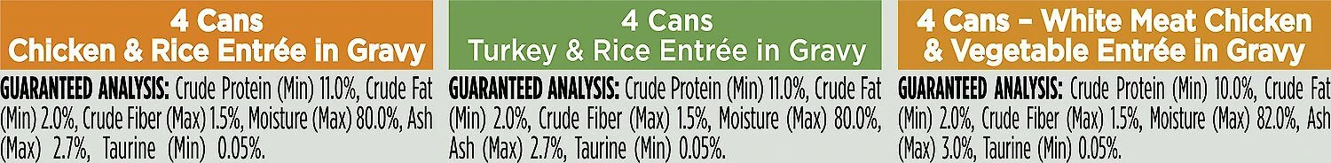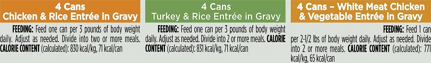 - This variety pack comes with 8 cans of 3 delectable recipes—Chicken & Rice Entrée, Turkey & Rice Entrée, and White Meat Chicken & Vegetables Entrée.