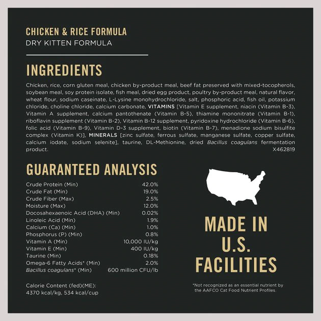 Chicken & Rice: Chicken, Rice, Corn Gluten Meal, Chicken By-Product Meal, Beef Fat Preserved With Mixed-Tocopherols, Soybean Meal, Soy Protein Isolate, Fish Meal, Dried Egg Product, Poultry By-Product Meal, Natural Flavor, Wheat Flour, Sodium Caseinate, L-Lysine Monohydrochloride, Salt, Phosphoric Acid, Fish Oil, Potassium Chloride, Choline Chloride, Calcium Carbonate, VITAMINS [Vitamin E Supplement, Niacin (Vitamin B-3), Vitamin A Supplement, Calcium Pantothenate (Vitamin B-5), Thiamine Mononitrate (Vitamin B-1), Riboflavin Supplement (Vitamin B-2), Vitamin B-12 Supplement, Pyridoxine Hydrochloride (Vitamin B-6), Folic Acid (Vitamin B-9), Vitamin D-3 Supplement, Biotin (Vitamin B-7), Menadione Sodium Bisulfite Complex (Vitamin K)], MINERALS [Zinc Sulfate, Ferrous Sulfate, Manganese Sulfate, Copper Sulfate, Calcium Iodate, Sodium Selenite], Taurine, DL-Methionine, Dried Bacillus Coagulans Fermentation Product.