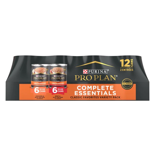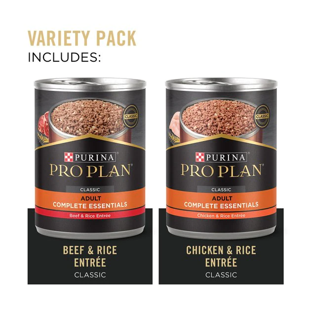 Plate up the classic recipes pooches love with Purina Pro Plan COMPLETE ESSENTIALS Classic Adult Wet Dog Food Variety Pack. Dogs adore this tasty duo, which has two delicious recipes worth begging for. Real chicken or beef is the number1 ingredient, helping create two high protein wet dog food entrees that support your pal’s lean muscles on his daily adventures. Plus, both super premium dog food recipes blend in other high-quality ingredients, like highly digestible rice, each carefully chosen for a purpose. Best of all, pups come running for the delicious taste and tender texture of these canned ground dog food loaf entrees. Variety is the spice of life, so rotate the recipes in this canned dog food variety pack to create a sensational dining experience at every meal.