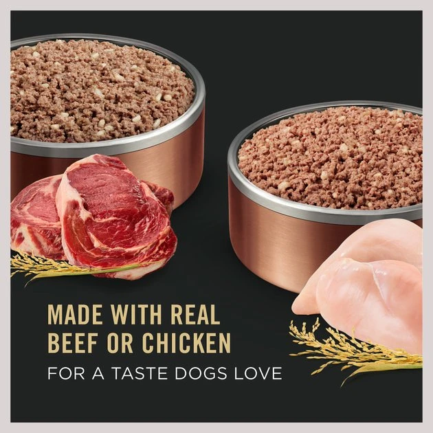 - Pups choose from two high quality dog food recipes, each with real chicken or beef as the number1 ingredient for a taste dogs adore.