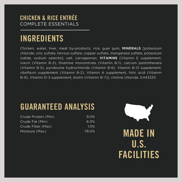 Chicken & Rice: Chicken, Water Sufficient For Processing, Liver, Meat By-Products, Rice, Guar Gum, Potassium Chloride, Salt, Carrageenan, Added Color, Calcium Carbonate, Vitamin E Supplement, Zinc Sulfate, Ferrous Sulfate, Choline Chloride, Niacin, Thiamine Mononitrate, Copper Sulfate, Calcium Pantothenate, Manganese Sulfate, Pyridoxine Hydrochloride, Vitamin B-12 Supplement, Riboflavin Supplement, Vitamin A Supplement, Folic Acid, Vitamin D-3 Supplement, Biotin, Potassium Iodide, Sodium Selenite. D-4433.