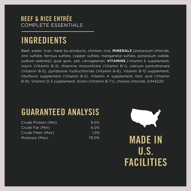 Beef & Rice: Beef, Water Sufficient For Processing, Liver, Meat By-Products, Chicken, Rice, Guar Gum, Potassium Chloride, Added Color, Salt, Carrageenan, Calcium Carbonate, Vitamin E Supplement, Zinc Sulfate, Ferrous Sulfate, Choline Chloride, Niacin, Thiamine Mononitrate, Copper Sulfate, Calcium Pantothenate, Manganese Sulfate, Pyridoxine Hydrochloride, Vitamin B-12 Supplement, Riboflavin Supplement, Vitamin A Supplement, Folic Acid, Potassium Iodide, Vitamin D-3 Supplement, Biotin, Sodium Selenite. D-4432.