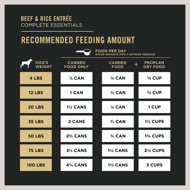 | Weight | Canned Food Only (cans) | Canned (cans) + Pro Plan Dry Formula (cups) |