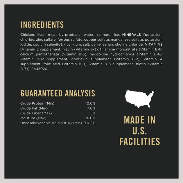 New: Chicken, Liver, Meat By-Products, Water, Salmon, Rice, MINERALS [Potassium Chloride, Zinc Sulfate, Ferrous Sulfate, Copper Sulfate, Manganese Sulfate, Potassium Iodide, Sodium Selenite], Guar Gum, Salt, Carrageenan, Choline Chloride, VITAMINS [Vitamin E Supplement, Niacin (Vitamin B-3), Thiamine Mononitrate (Vitamin B-1), Calcium Pantothenate (Vitamin B-5), Pyridoxine Hydrochloride (Vitamin B-6), Vitamin B-12 Supplement, Riboflavin Supplement (Vitamin B-2), Vitamin A Supplement, Folic Acid (Vitamin B-9), Vitamin D-3 Supplement, Biotin (Vitamin B-7)]. E443020.
