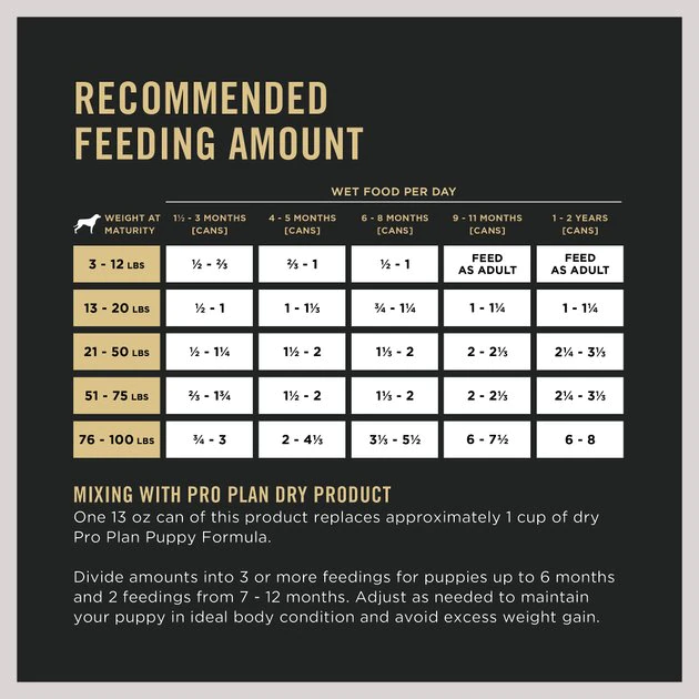 One 13 oz can of this product replaces approximately 1 cup of dry Pro Plan Puppy Formula. Divide amounts into 3 or more feedings for puppies up to 6 months and 2 feedings from 7 – 12 months. Adjust as needed to maintain your puppy in ideal body condition and avoid excess weight gain.