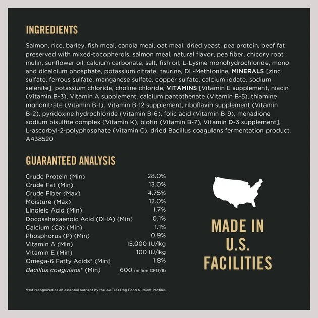 Salmon, Rice, Barley, Fish Meal, Canola Meal, Oat Meal, Dried Yeast, Pea Protein, Beef Fat Preserved With Mixed-Tocopherols, Salmon Meal, Natural Flavor, Pea Fiber, Chicory Root Inulin, Sunflower Oil, Calcium Carbonate, Salt, Fish Oil, L-Lysine Monohydrochloride, Mono And Dicalcium Phosphate, Potassium Citrate, Taurine, DL-Methionine, MINERALS [Zinc Sulfate, Ferrous Sulfate, Manganese Sulfate, Copper Sulfate, Calcium Iodate, Sodium Selenite], Potassium Chloride, Choline Chloride, VITAMINS [Vitamin E Supplement, Niacin (Vitamin B-3), Vitamin A Supplement, Calcium Pantothenate (Vitamin B-5), Thiamine Mononitrate (Vitamin B-1), Vitamin B-12 Supplement, Riboflavin Supplement (Vitamin B-2), Pyridoxine Hydrochloride (Vitamin B-6), Folic Acid (Vitamin B-9), Menadione Sodium Bisulfite Complex (Vitamin K), Biotin (Vitamin B-7), Vitamin D-3 Supplement], L-Ascorbyl-2-Polyphosphate (Vitamin C), Dried Bacillus Coagulans Fermentation Product. A438520