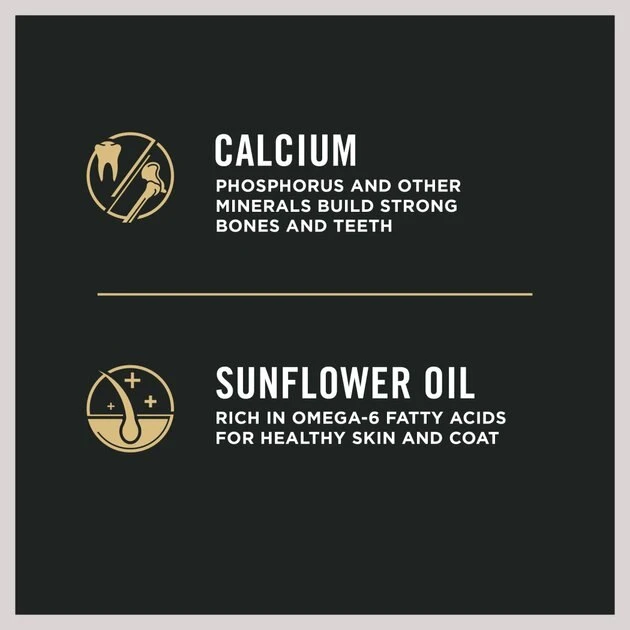 - Vitamin A and sunflower oil are included to promote skin and coat health.
