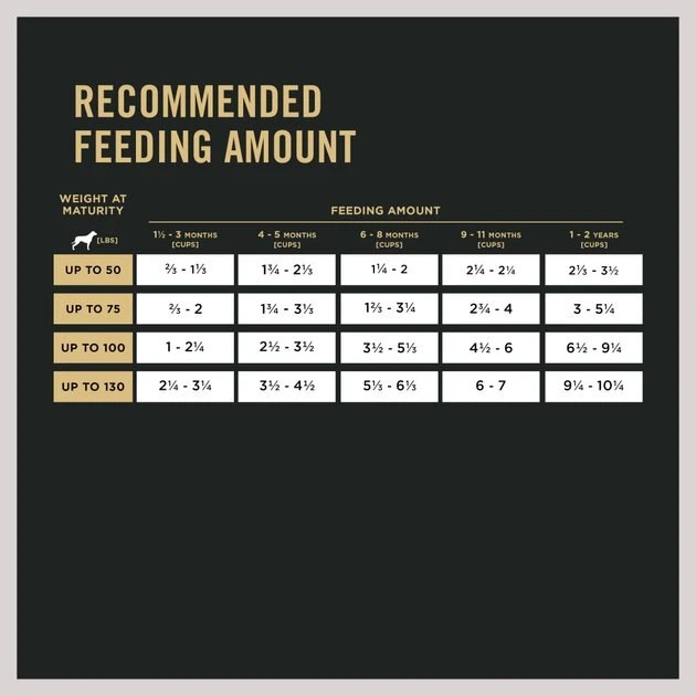 | Weight at Maturity (lbs) | 1 1/2 – 3 Months (Cups) | 4 – 5 Months (Cups) | 6 – 8 Months (Cups) | 9 – 11 Months (Cups) | 1 – 2 Years (Cups) |