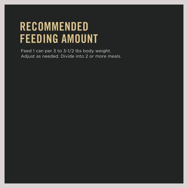 Feed 1 can per 3 to 3 1/2 lbs body weight. Adjust as needed. Divide into 2 or more meals.
