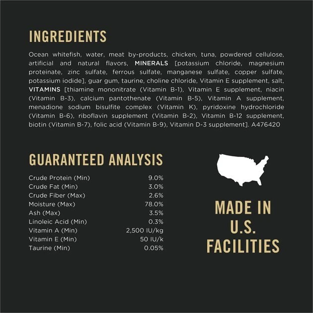 Ocean Whitefish, Water, Meat By-Products, Chicken, Tuna, Powdered Cellulose, Artificial And Natural Flavors, MINERALS [Potassium Chloride, Magnesium Proteinate, Zinc Sulfate, Ferrous Sulfate, Manganese Sulfate, Copper Sulfate, Potassium Iodide], Guar Gum, Taurine, Choline Chloride, Vitamin E Supplement, Salt, VITAMINS [Thiamine Mononitrate (Vitamin B-1), Vitamin E Supplement, Niacin (Vitamin B-3), Calcium Pantothenate (Vitamin B-5), Vitamin A Supplement, Menadione Sodium Bisulfite Complex (Vitamin K), Pyridoxine Hydrochloride (Vitamin B-6), Riboflavin Supplement (Vitamin B-2), Vitamin B-12 Supplement, Biotin (Vitamin B-7), Folic Acid (Vitamin B-9), Vitamin D-3 Supplement].