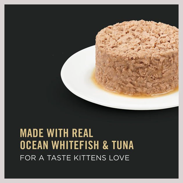 Give your kitten the nutrition she needs to grow up big and strong with Purina Pro Plan DEVELOPMENT Flaked Ocean Whitefish and Tuna Entree Wet Kitten Food. It’s made to support the healthy growth and development of kittens throughout their first year of life. With wholesome ingredients like real ocean whitefish and tuna, this high protein kitten food is bursting with yum. The canned kitten food is loaded with 25 essential vitamins and minerals and antioxidants to help nourish her developing immune system. Plus, the kitten formula has DHA for brain and vision development and vitamin A and taurine, an amino acid, to support her healthy vision. Plus, the highly digestible flaked wet cat food allows for optimal nutrient delivery, which means more goodness can get to work in your pal. Your kitten gets an ocean whitefish and tuna cat food that lets her delight in the wholesome goodness in every serving.