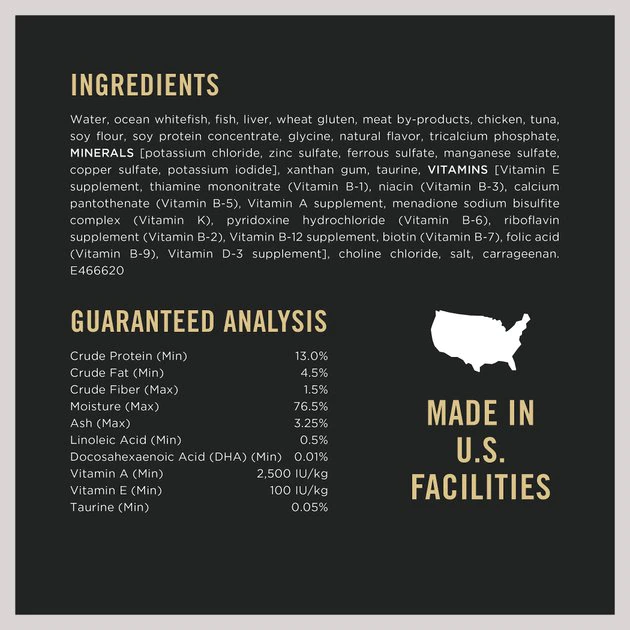 Water, Ocean Whitefish, Fish, Liver, Wheat Gluten, Meat By-Products, Chicken, Tuna, Soy Flour, Soy Protein Concentrate, Glycine, Natural Flavor, Tricalcium Phosphate, MINERALS [Potassium Chloride, Zinc Sulfate, Ferrous Sulfate, Manganese Sulfate, Copper Sulfate, Potassium Iodide], Xanthan Gum, Taurine, VITAMINS [Vitamin E Supplement, Thiamine Mononitrate (Vitamin B-1), Niacin (Vitamin B-3), Calcium Pantothenate (Vitamin B-5), Vitamin A Supplement, Menadione Sodium Bisulfite Complex (Vitamin K), Pyridoxine Hydrochloride (Vitamin B-6), Riboflavin Supplement (Vitamin B-2), Vitamin B-12 Supplement, Biotin (Vitamin B-7), Folic Acid (Vitamin B-9), Vitamin D-3 Supplement], Choline Chloride, Salt, Carrageenan. E466620.