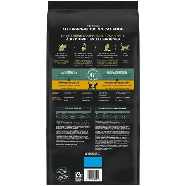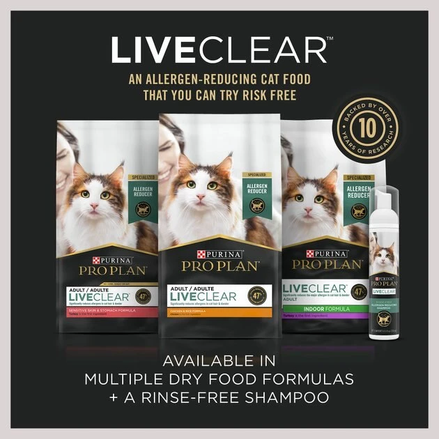 - Backed by over a decade of research, Purina Pro Plan LIVECLEAR cat food is the first and only line with the power to reduce cat allergens.