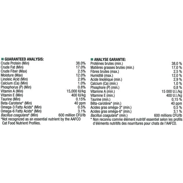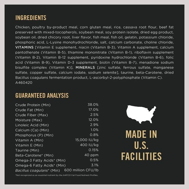 Chicken, Poultry By-product Meal, Corn Gluten Meal, Rice, Cassava Root Flour, Beef Fat Preserved With Mixed-tocopherols, Soybean Meal, Soy Protein Isolate, Dried Egg Product, Soybean Oil, Dried Chicory Root, Liver Flavor, Fish Meal, Fish Oil, Gelatin, Potassium Chloride, Phosphoric Acid, L-lysine Monohydrochloride, Salt, Calcium Carbonate, Choline Chloride, Vitamins [Vitamin E Supplement, Niacin (Vitamin B-3), Vitamin A Supplement, Calcium Pantothenate (Vitamin B-5), Thiamine Mononitrate (Vitamin B-1), Riboflavin Supplement (Vitamin B-2), Vitamin B-12 Supplement, Pyridoxine Hydrochloride (Vitamin B-6), Folic Acid (Vitamin B-9), Vitamin D-3 Supplement, Biotin (Vitamin B-7), Menadione Sodium Bisulfite Complex (Vitamin K)], Minerals [Zinc Sulfate, Ferrous Sulfate, Manganese Sulfate, Copper Sulfate, Calcium Iodate, Sodium Selenite], Taurine, Beta-carotene, Dried Bacillus Coagulans Fermentation Product, L-ascorbyl-2-polyphosphate (Vitamin C). A460420