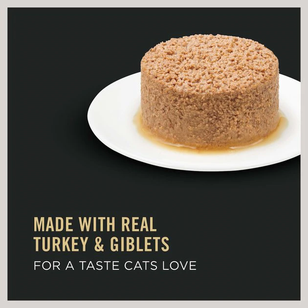 Support your kitty into her senior years with Purina Pro Plan Prime Plus Turkey and Giblets Entree Senior Adult 7+ Wet Cat Food Pate. Backed by a nine-year study, this canned senior cat food wows with a proprietary blend. Plus, this tender pate is packed with the flavors your poultry-loving pal adores. Real turkey is the number 1 ingredient, and real giblets are added to create a sensationally savory combo. The high protein cat food helps support your feline friend’s lean muscles as she jumps and plays throughout her golden years. Best of all, each serving helps her maintain a healthy weight, too. With yummy flavor and tender texture, this soft cat food for senior cats is loaded with the goodness your older kitty adores and delivers the support she needs.