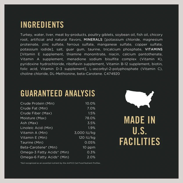 Turkey, Water, Liver, Meat By-Products, Poultry Giblets, Soybean Oil, Fish Oil, Chicory Root, Artificial And Natural Flavors, Minerals [Potassium Chloride, Magnesium Proteinate, Zinc Sulfate, Ferrous Sulfate, Manganese Sulfate, Copper Sulfate, Potassium Iodide], Salt, Guar Gum, Taurine, Tricalcium Phosphate, Vitamins [Vitamin E Supplement, Thiamine Mononitrate, Niacin, Calcium Pantothenate, Vitamin A Supplement, Menadione Sodium Bisulfite Complex (Vitamin K), Pyridoxine Hydrochloride, Riboflavin Supplement, Vitamin B-12 Supplement, Biotin, Folic Acid, Vitamin D-3 Supplement], L-Ascorbyl-2- Polyphosphate (Vitamin C), Choline Chloride, Dl-Methionine, Beta-Carotene. C474920.