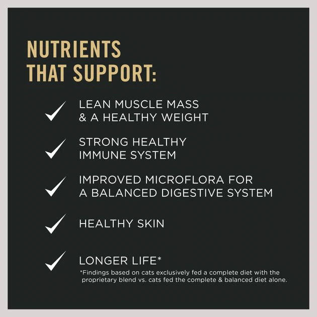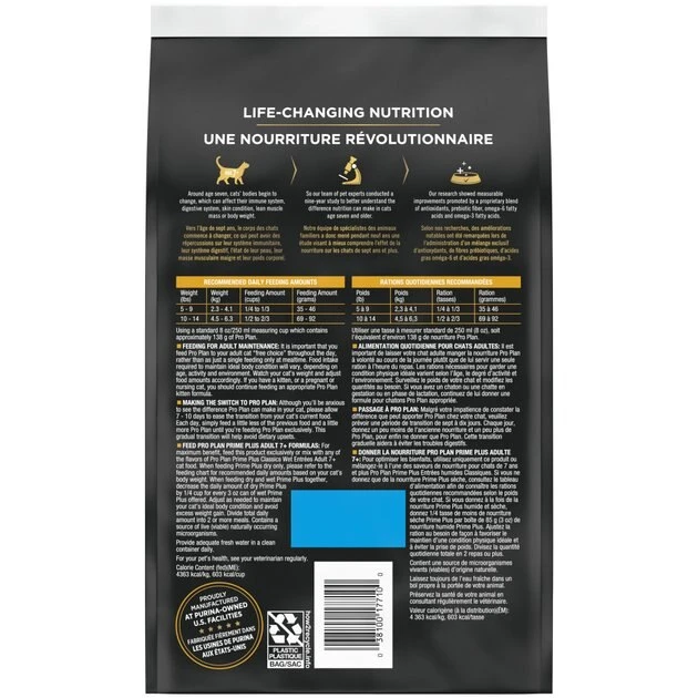 For maximum benefit, feed this product exclusively or mix with any of the flavors of Pro Plan Prime Plus Classics Wet Entrées Adult 7+ cat food. When feeding Prime Plus dry only, please refer to the feeding chart for recommended daily amounts based on your cat’s body weight. When feeding dry and wet Prime Plus together: Decrease the daily amount of dry Prime Plus by 1/4 cup for every 3 oz can of wet Prime Plus offered. Adjust as needed to maintain your cat’s ideal body condition and avoid excess weight gain. Divide total daily amount into 2 or more meals.