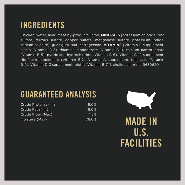 Chicken, Water Sufficient For Processing, Liver, Meat By-Products, Lamb, ESSENTIAL NUTRIENTS AND OTHER INGREDIENTS: Minerals (Potassium Chloride, Salt, Calcium Carbonate, Zinc Sulfate, Ferrous Sulfate, Copper Sulfate, Manganese Sulfate, Potassium Iodide, Sodium Selenite), Guar Gum, Carrageenan, Vitamins (Vitamin E, Choline, Vitamin B-3, Vitamin B-1, Vitamin B-5, Vitamin B-6, Vitamin B-12, Vitamin B-2, Vitamin A, Folic Acid, Vitamin D-3, Vitamin B-7). A630618.