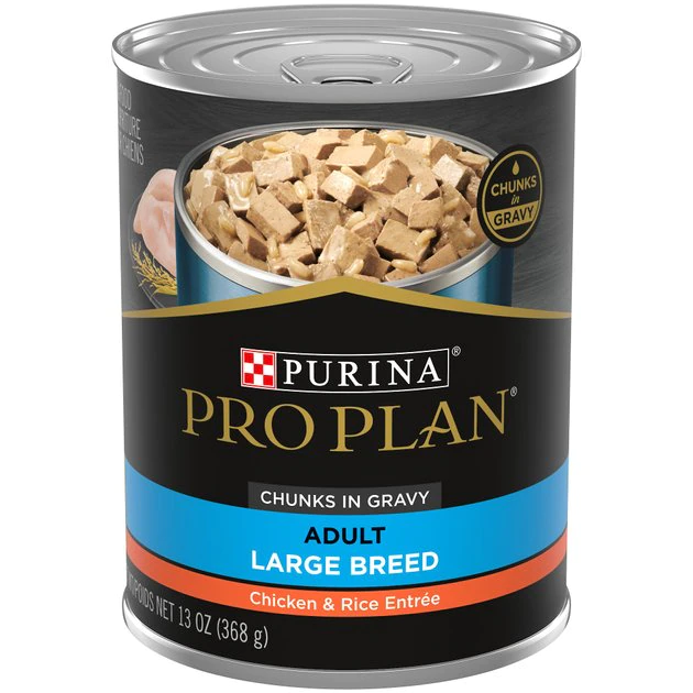 Set out a savory meal made for the big dogs like yours with Purina Pro Plan SPECIALIZED Adult Large Breed Chicken and Rice Entree Chunks in Gravy Adult Wet Dog Food. Made for large breeds, this canned dog food delivers a combo of quality ingredients chosen to support your big pal’s well-being. The tender chunks are made with real chicken, and rice is mixed in for a highly digestible source of energy. Plus, a helping of gravy adds a flavorful finish. Each serving is chock full of protein to promote muscle conditioning when combined with exercise on your dog’s daily adventures. And, he gets calcium and phosphorus to help keep his bones and teeth strong as well as omega-6 fatty acids to nourish his skin and soft coat. With complete and balanced nutrition for adult dogs over 50 pounds, this large breed dog food is bursting with the targeted nutrition your pal needs to jump, race and play. Try this chicken dog food risk free for a tasty meal that nourishes your bud from nose to tail.