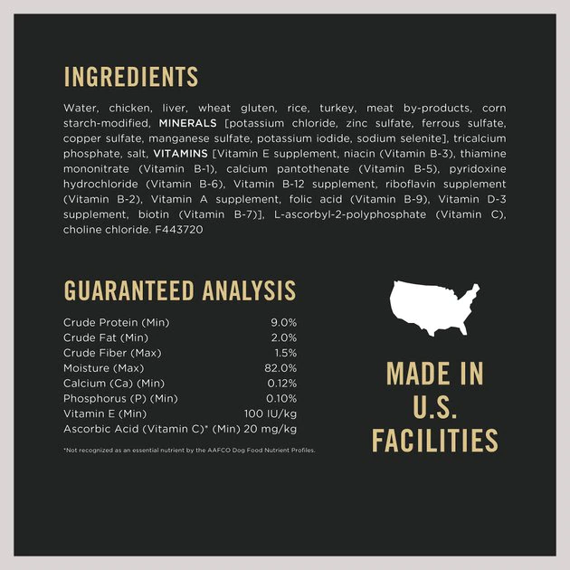 New: Water, Chicken, Liver, Wheat Gluten, Rice, Turkey, Meat By-Products, Corn Starch-Modified, MINERALS [Potassium Chloride, Zinc Sulfate, Ferrous Sulfate, Copper Sulfate, Manganese Sulfate, Potassium Iodide, Sodium Selenite], Tricalcium Phosphate, Salt, VITAMINS [Vitamin E Supplement, Niacin (Vitamin B-3), Thiamine Mononitrate (Vitamin B-1), Calcium Pantothenate (Vitamin B-5), Pyridoxine Hydrochloride (Vitamin B-6), Vitamin B-12 Supplement, Riboflavin Supplement (Vitamin B-2), Vitamin A Supplement, Folic Acid (Vitamin B-9), Vitamin D-3 Supplement, Biotin (Vitamin B-7)], L-Ascorbyl-2-Polyphosphate (Vitamin C), Choline Chloride. F443720.