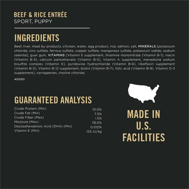 Start your active puppy out on the right track by introducing them to Purina Pro Plan Sport Development Puppy High Protein Beef & Rice Wet Dog Food. With real beef as its #1 ingredient, this active dog food for puppies offers up 100% complete and balanced nutrition to power your puppies’ athletic lifestyle. Also included is a blend of 23 essential vitamins and minerals to support overall health and antioxidants for dogs to boost healthy immune function. This Purina Pro Plan Puppy Food is high in protein to help growing puppies build lean muscle and includes DHA to support brain and vision development. Purina Pro Plan puppy foods are proudly manufactured at Purina-owned U.S. facilities, where they are rigorously tested for quality and safety.