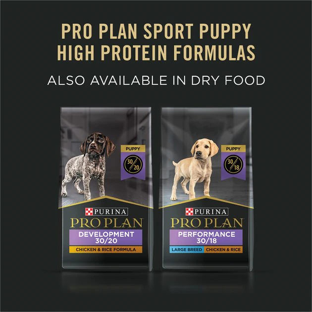 - Purina high-protein wet dog food for puppies to promote lean muscle in growing puppies.