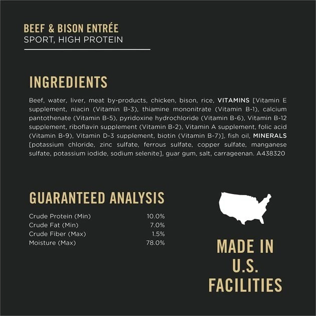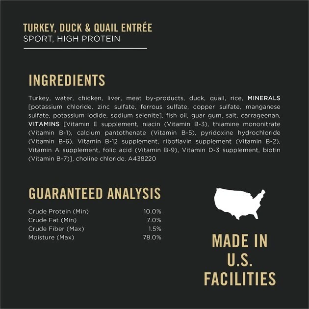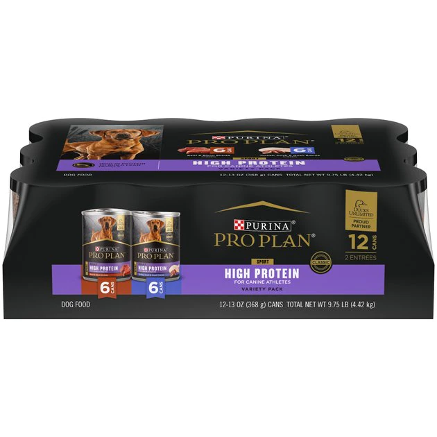 Pro Plan Sport High Protein Wet Dog Food Variety Pack delivers two delicious options to satisfy the novelty-seeking tastebuds of active dogs everywhere. The two satisfying formulas are Beef & Bison and Turkey, Duck & Quail options. And each formula has real meat or poultry as the first ingredients. Suitable as both a complete meal or an enhancement, each formula can be served between meals—on its own—or as a dry dog food topping. Each serving of these paté dog food formulas is 100 percent complete and balanced for canine athletes and features 23 essential vitamins and nutrients to support active lifestyles. Plus, it has moisture to support healthy hydration to help dogs achieve their full athletic potential. Made with antioxidants, this concentrated formula also helps support a healthy immune system. Plus, Pro Plan Sport is the official performance dog food of Ducks Unlimited. So when you offer this to your hardworking, active dog, you’re giving him innovative nutrition that performs.