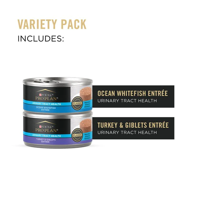 Make a menu of recipes for your kitty with a Purina Pro Plan Urinary Tract Health Classic Favorites Adult Wet Cat Food Variety Pack. This urinary cat food variety pack has two of your pal’s favorite classic recipes, each specially made to help maintain urinary tract health. Cats pick from whisker-licking cat food pates made with real ocean whitefish or real turkey and giblets. Both yummy formulas provide low dietary magnesium while reducing urinary pH. Plus, each high protein cat food selection is jam-packed with high-quality ingredients that nourish your feline friend. Both urinary wet cat food pate formulas are highly digestible, too, helping more wholesome goodness go to work in your cat. Try this premium cat food variety pack risk free to deliver the extra-care nutrition your furry companion needs and the delicious taste she loves.