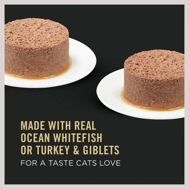 - Real turkey and giblets or ocean whitefish are blended into these tender pate cat food selections, bringing on the taste and texture kitties love.