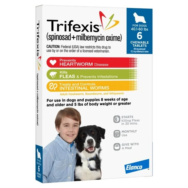 Trifexis is a monthly, chewable tablet for dogs. Trifexis kills fleas and prevents flea infestations on dogs, treats and controls adult hookworm*, whipworm and roundworm infections, and prevents heartworm disease. Trifexis is for use in dogs and puppies 8 weeks of age or older and 5 pounds of body weight or greater. If you do not administer Trifexis monthly throughout the year, continue administering the medication for at least three months following the last exposure to mosquitoes.
